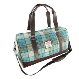 BRAW CLANS TARTANS Authentic Harris Tweed Weekend Travel Bag – 100% Wool Harris Tweed outer – large bag with zip closure and padded, adjustable shoulder strap. – Fabric woven in Scotland – LB1026 – Turquoise Tartan