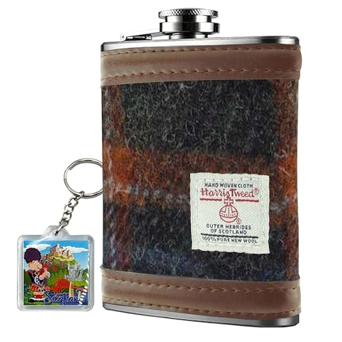 6oz Harris Tweed Hip Flask – Stainless Steel Tartan Liquor Hip flasks for Men – Leak Proof – Pocket Friendly – Gift Box, Keyring – Christmas – Liquor, Whisky, Rum – Grey With Rust Overcheck