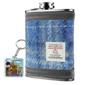 6oz Harris Tweed Hip Flask – Stainless Steel Tartan Liquor Hip flasks for Men – Leak Proof – Pocket Friendly – Gift Box, Keyring – Christmas – Liquor, Whisky, Rum – Light Blue Check