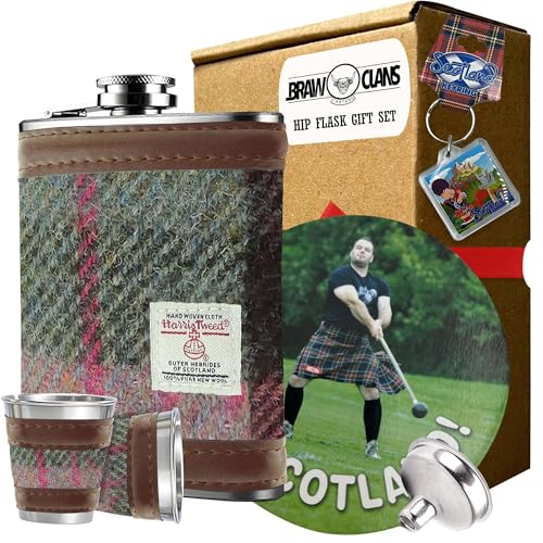 BRAW-CLANS-TARTANS-Gift-Box-6oz-Harris-Tweed-Hip-Flask-Shot-Glasses-Pour-Funnel-Coaster-Keyring–Stainless-Steel-Tartan-Liquor-flasks-for-Men-Leak-Proof-lid-Green-Rose-Pink-0