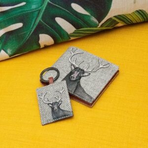 Kilts Wi Hae Grey Herringbone Tweed & Brown Leather Two Fold Mens Wallet with Highland Stag Applique