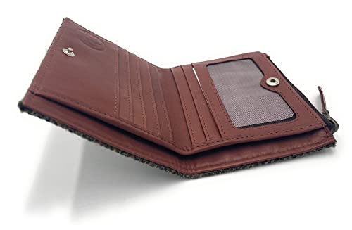 Women’s Harris Tweed Real Leather Small Bifold Wallet, Card Holder with Zipper Coin Purse Pocket – Brown Herringbone
