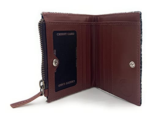 Women’s Harris Tweed Real Leather Small Bifold Wallet, Card Holder with Zipper Coin Purse Pocket – Grey Check