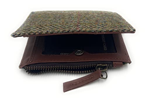 Women’s Harris Tweed Real Leather Small Bifold Wallet, Card Holder with Zipper Coin Purse Pocket – Green Herringbone