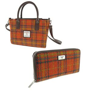 Glasgow Kilt Company Scottish clan Ladies Harris Tweed ‘Brora’ Small Tote with ‘Staffa’ Long Zip Purse 2 Piece hand bag and – gift set closure Adjustable detachable strap (Deep Orange Check) COL 108