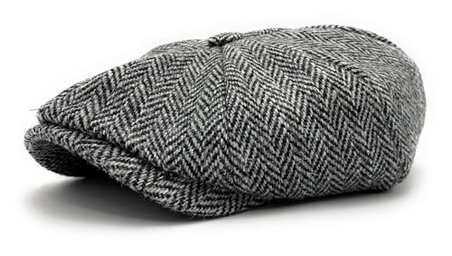 Harris Tweed Traditional Peak Eight Panel Newsboy Cap British Made – XL, Grey Herringbone