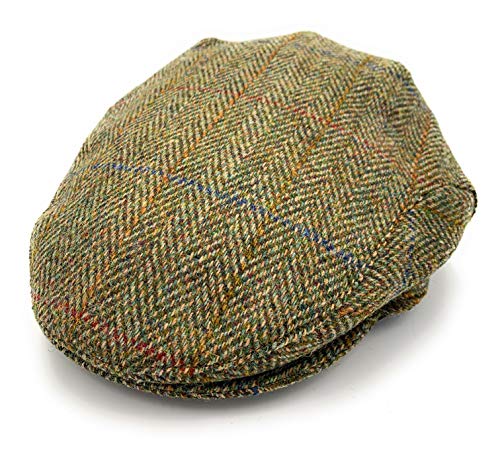 Mens Harris Tweed Flat Cap Comfort Fit Quilted Lining Made in Scotland S-XXL – XXL, Green Herringbone