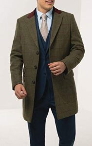 Dobell Mens Green Tweed Overcoat Regular Fit Windowpane Check Velvet Trims