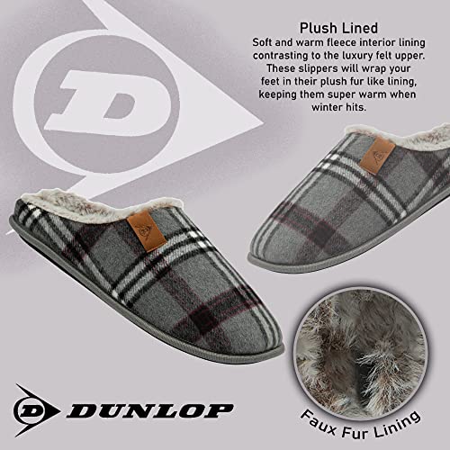 DUNLOP Mens Slippers Slip On Check Mules Faux Fur Lined Memory Foam Plush House Slippers Breathable Indoor Outdoor Shoes